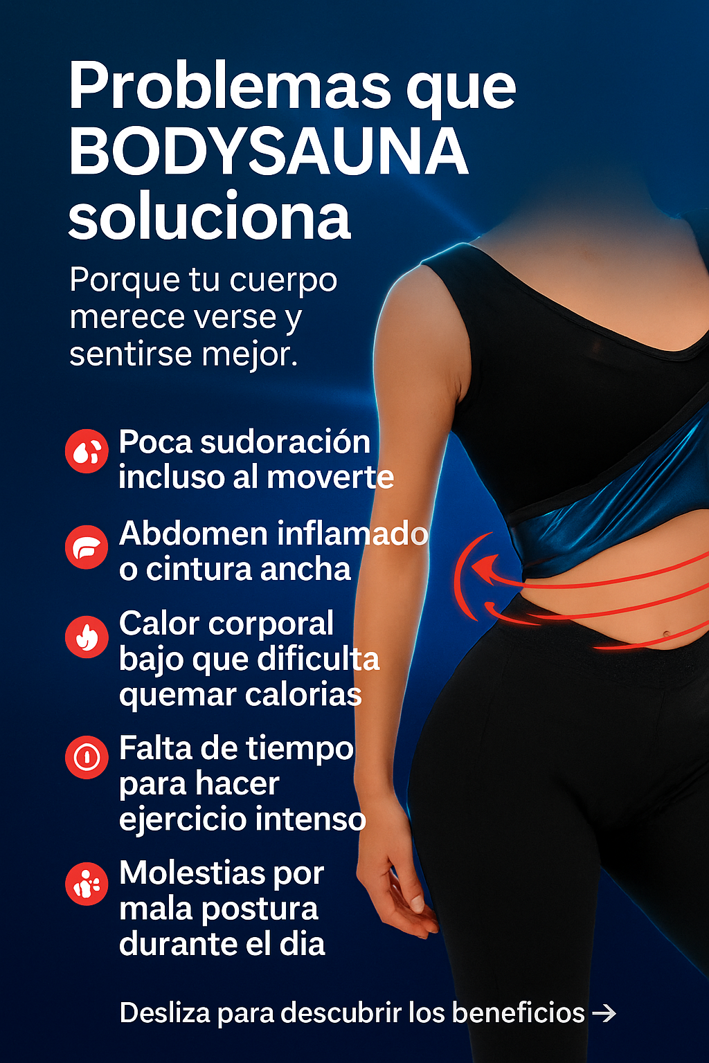 BodySauna Fit aumenta tu sudoración hasta tres veces, activando la eliminación de grasa localizada incluso sin entrenar. Su material térmico utiliza tu calor corporal para acelerar resultados mientras caminas, trabajas o haces tus actividades diarias. Es una forma inteligente de transformar tu figura sin estrés.