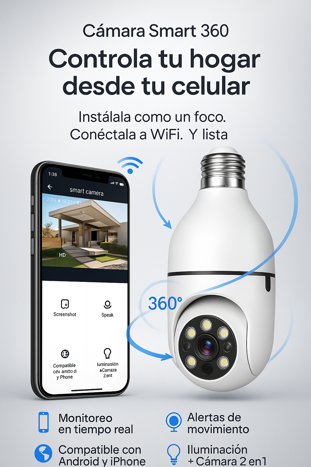 La Cámara Smart 360 se enrosca en cualquier portalámparas estándar. Una vez encendida, se conecta al WiFi del hogar y funciona desde la aplicación móvil. Permite monitoreo en vivo, visión nocturna, movimiento motorizado 360°, grabación y luz LED integrada. Cuando detecta movimiento, envía alertas instantáneas al celular del usuario.