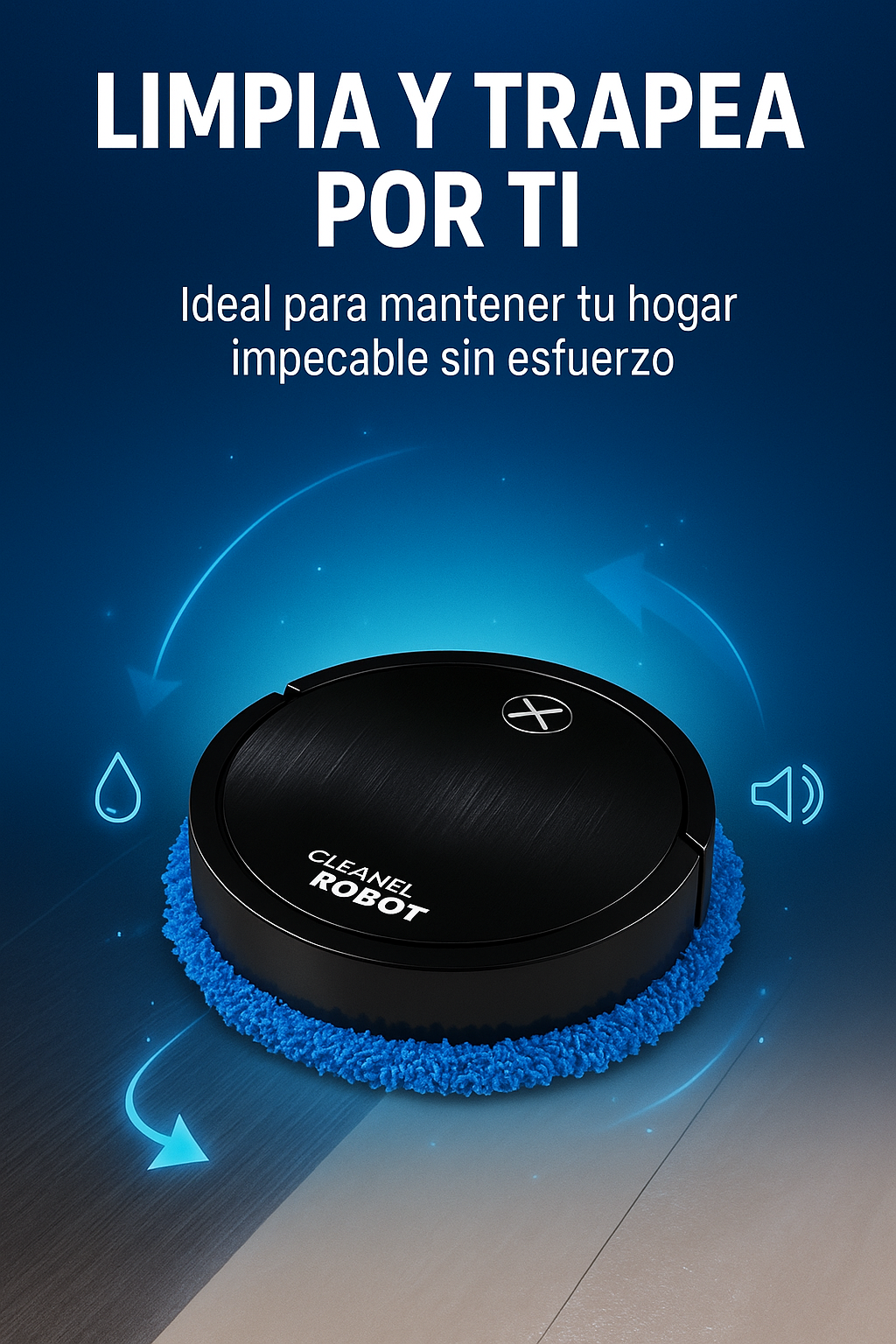 El RoboClean Mini opera de forma automática: activas un botón y comienza a desplazarse por toda la superficie atrapando polvo, pelos y suciedad. Su almohadilla de microfibra gira suavemente mientras absorbe cada partícula, dejando el piso limpio y uniforme sin esfuerzo humano.