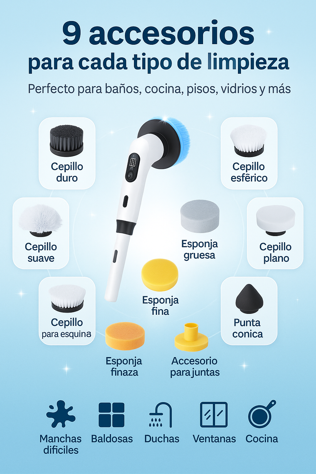 Cada accesorio está pensado para una superficie distinta. Pisos, paredes, juntas, vidrios, cocina… todo con un solo producto. Ahorras espacio, dinero y evitas tener 5 herramientas por toda la casa.