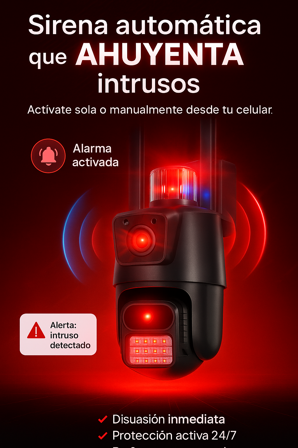 Prevención activa: “La sirena integrada disuade intrusos antes de que entren.”