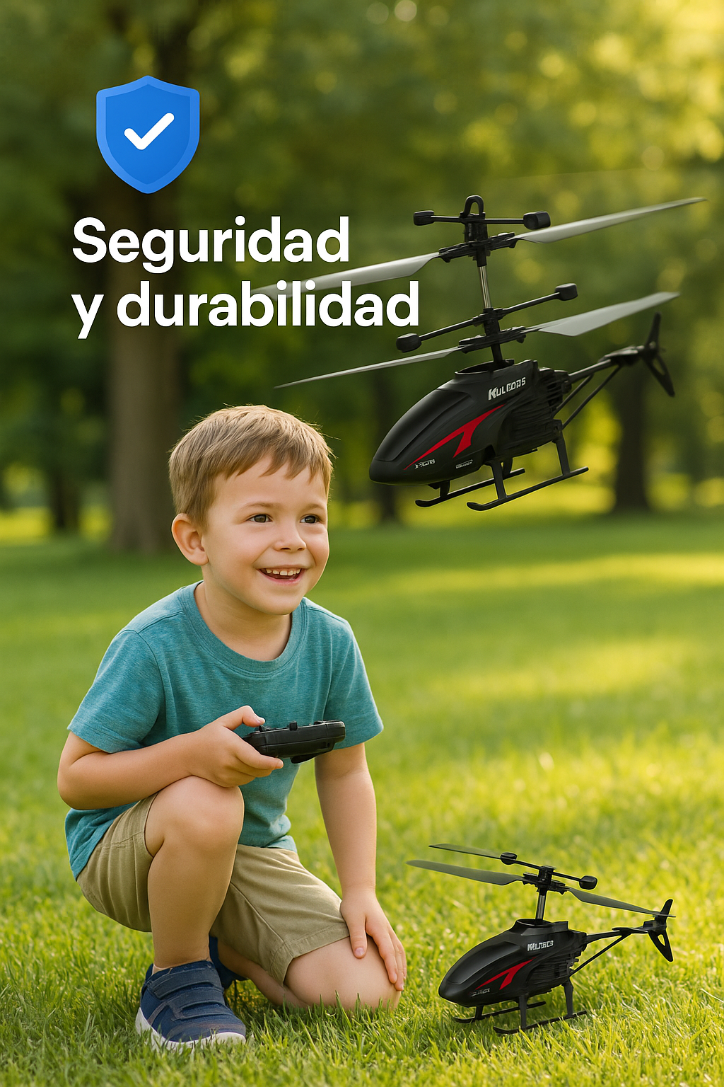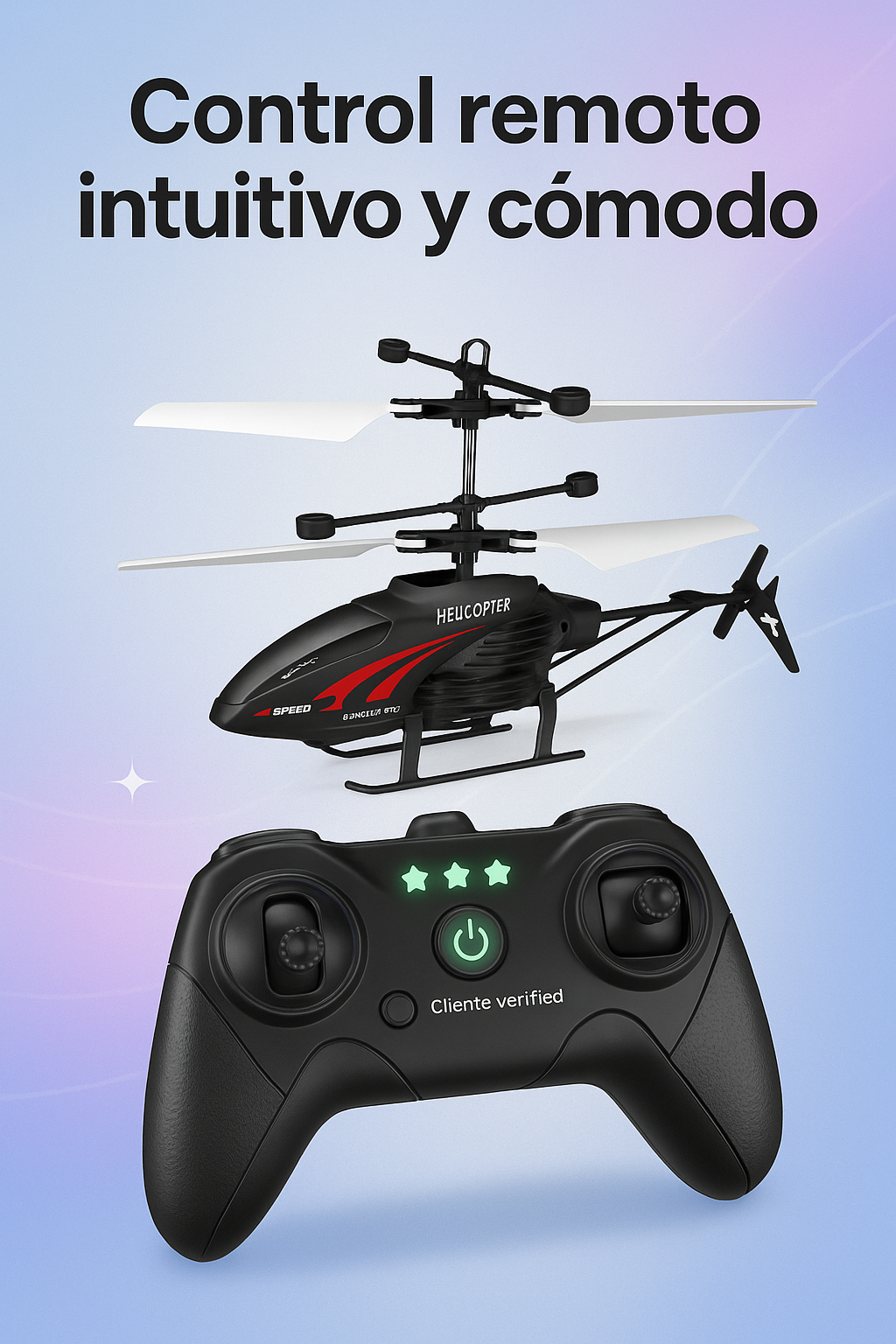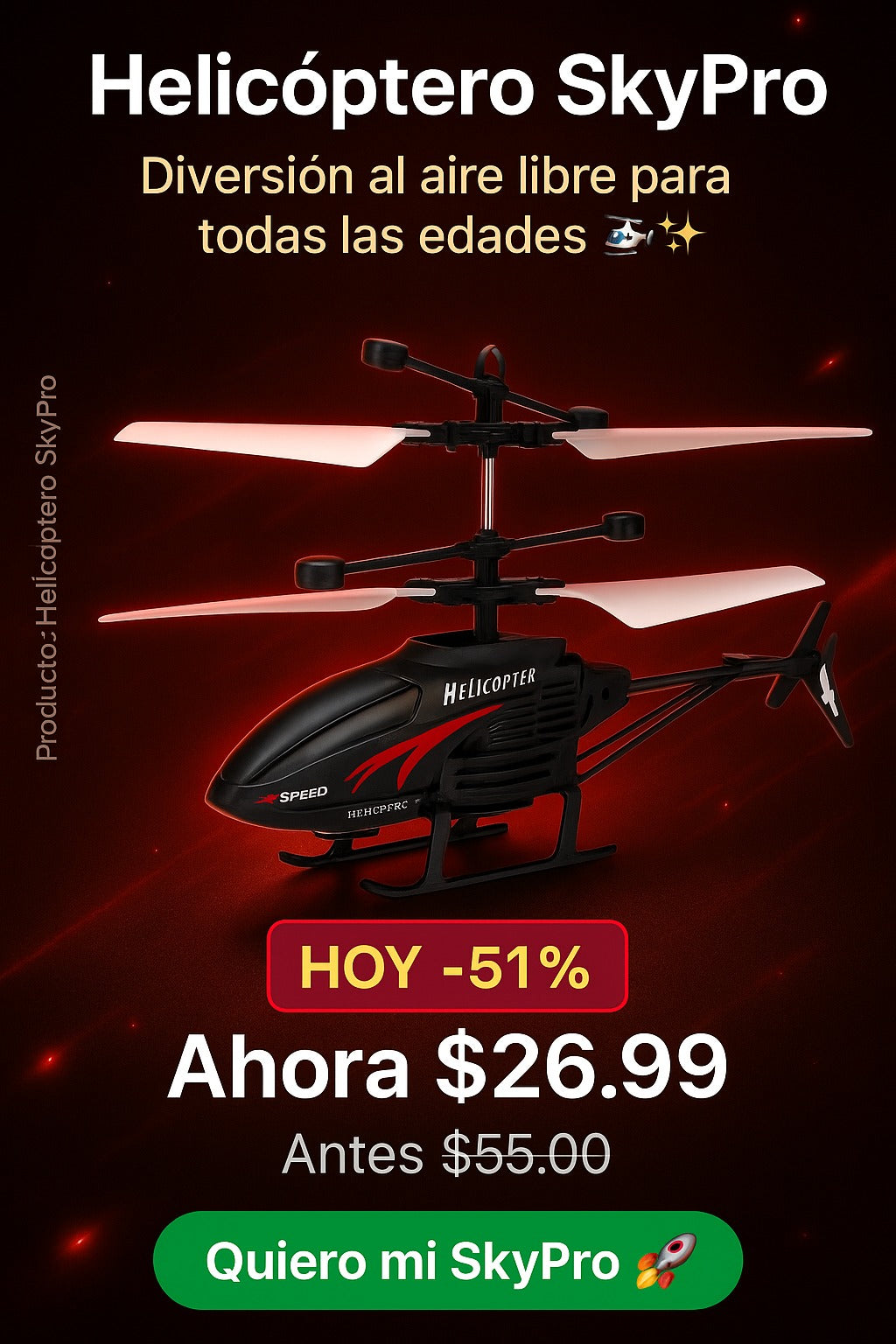 El Helicóptero SkyPro utiliza un sistema de doble hélice que genera estabilidad automática, permitiendo que cualquier persona —incluso niños— pueda controlarlo con facilidad.