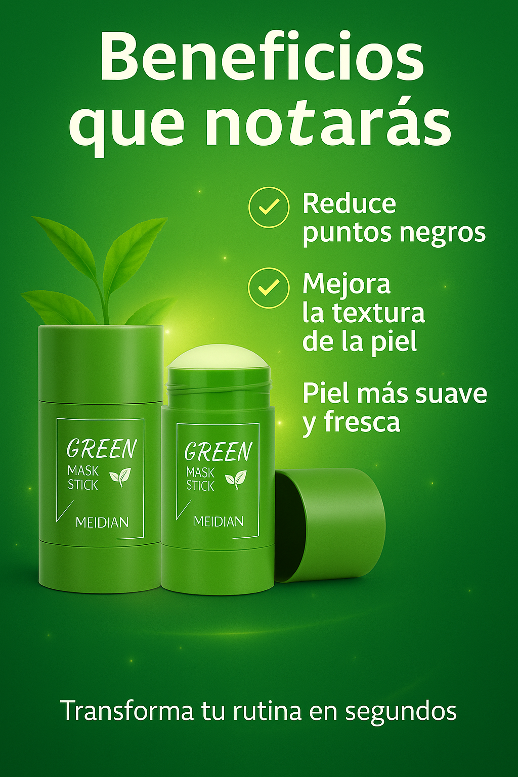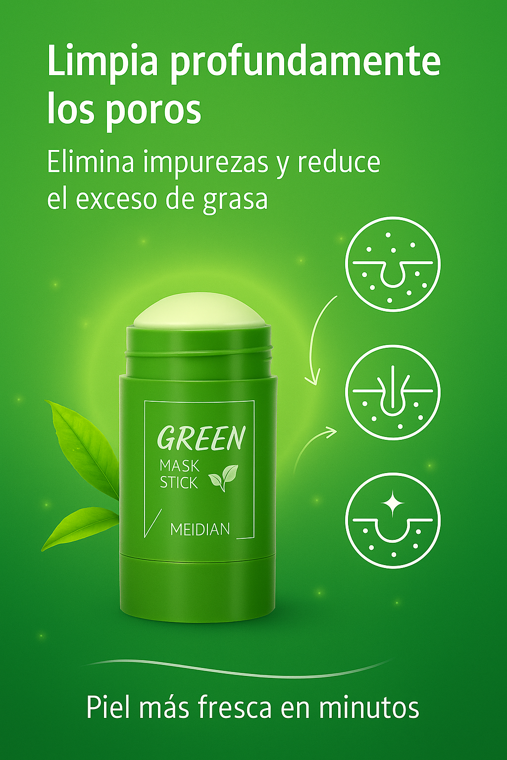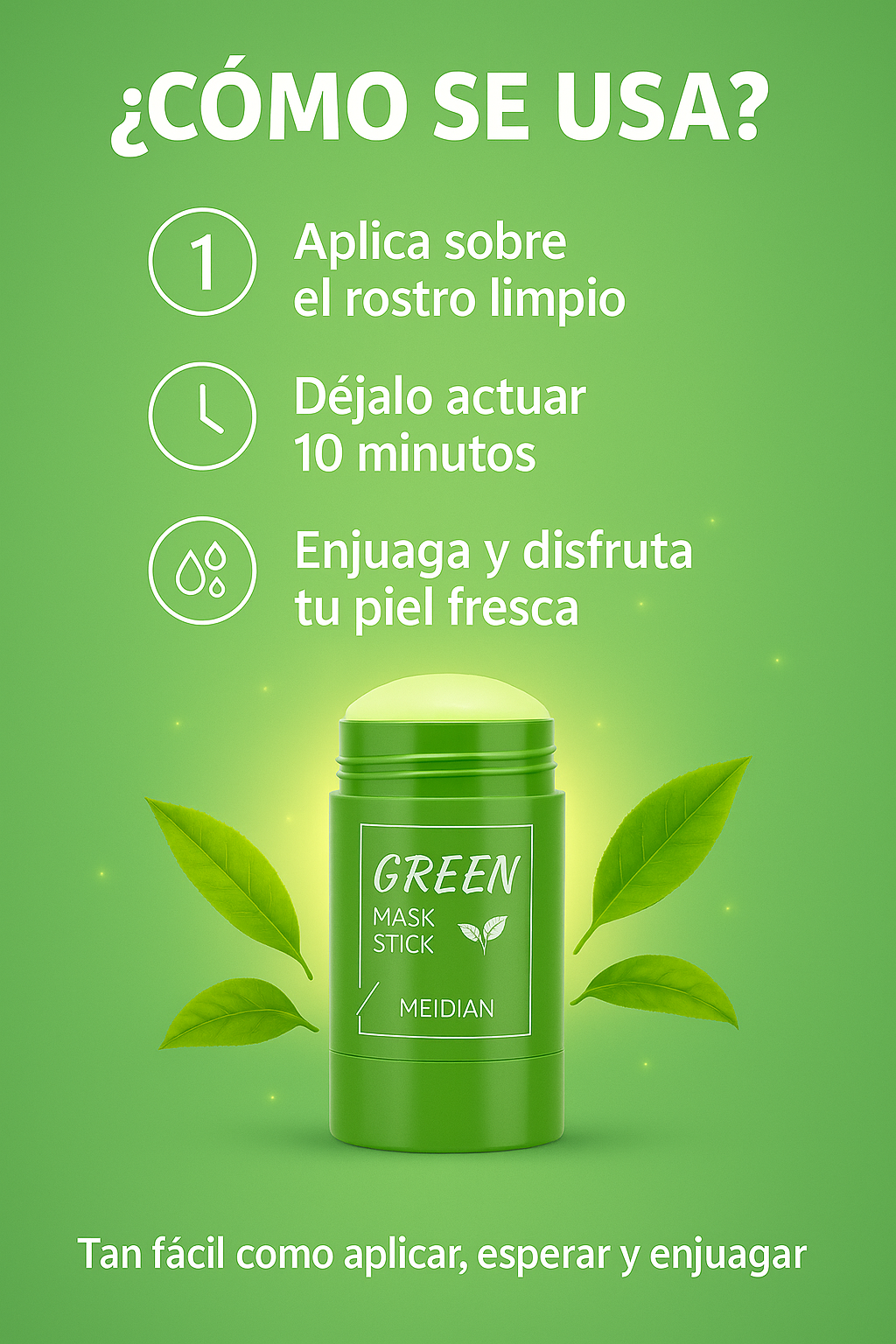 La mascarilla en stick penetra suavemente en los poros, absorbe la grasa acumulada, elimina impurezas y reduce puntos negros. Su fórmula de té verde actúa como purificante natural dejando la piel fresca y uniforme.