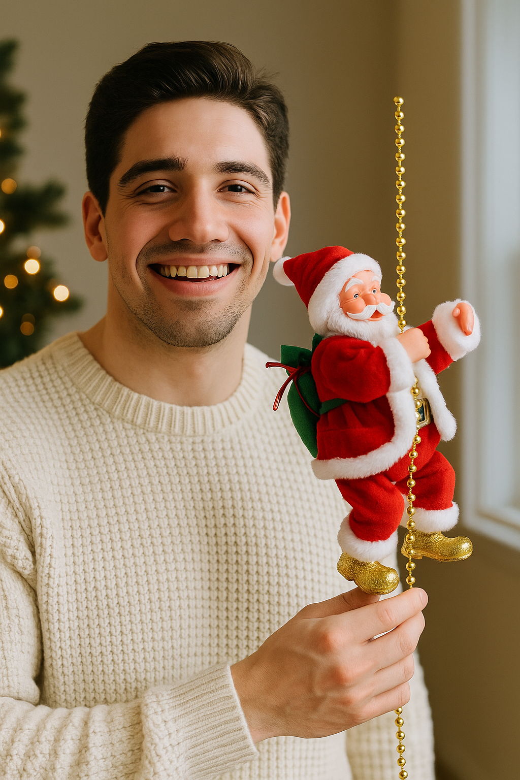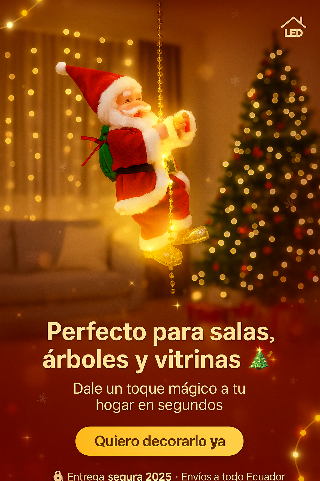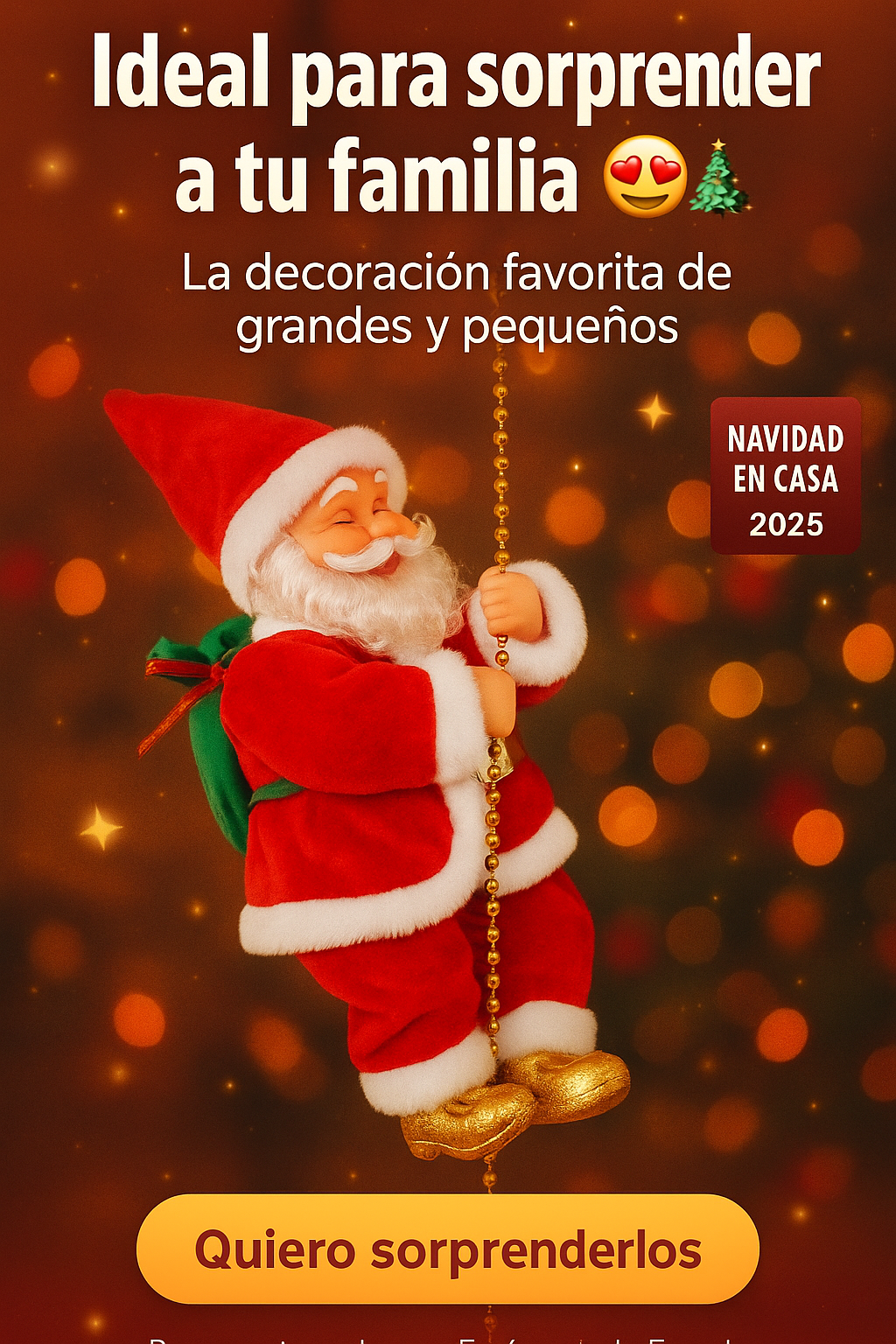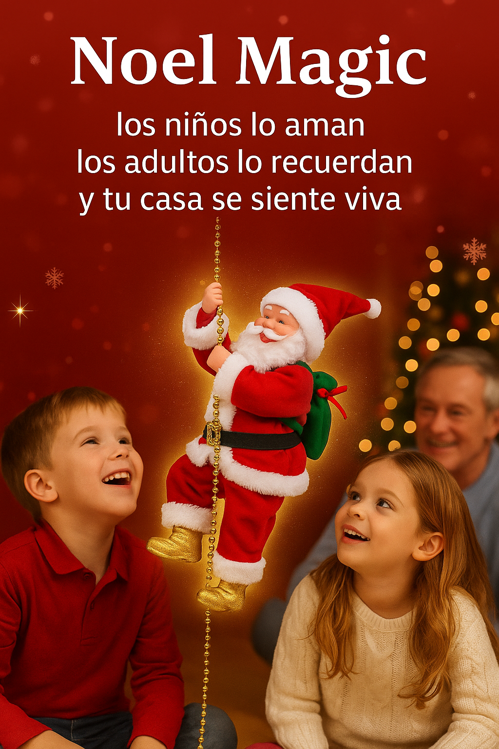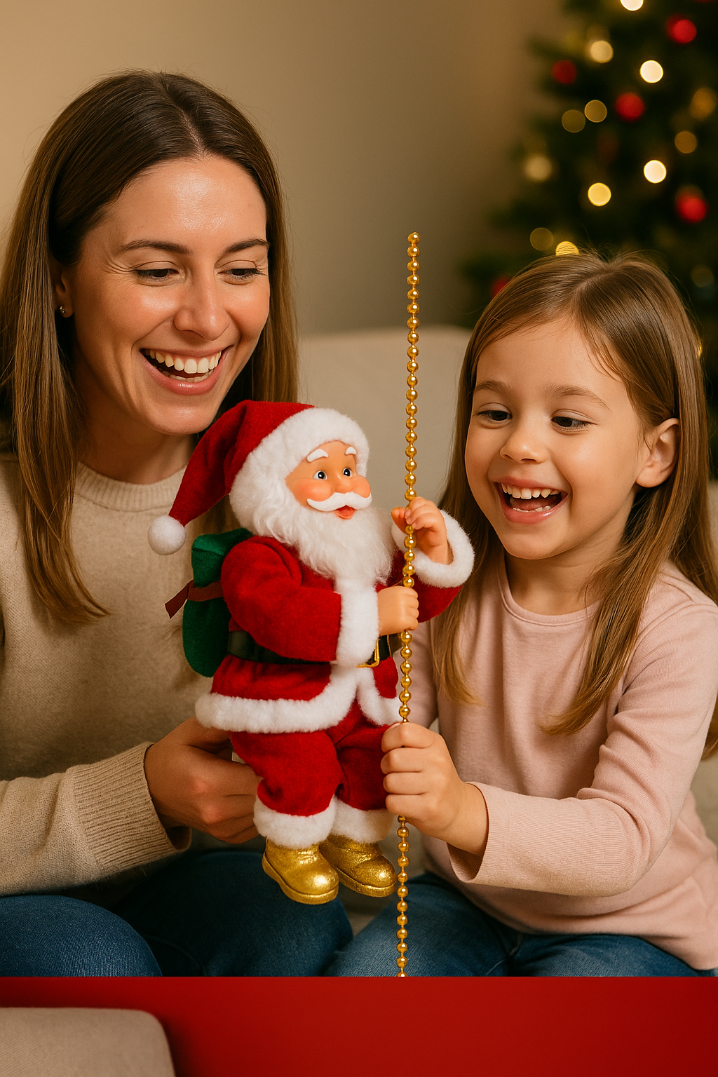 El mecanismo interno permite que Papá Noel suba y baje la cuerda de forma automática mientras enciende sus luces LED y reproduce música navideña.