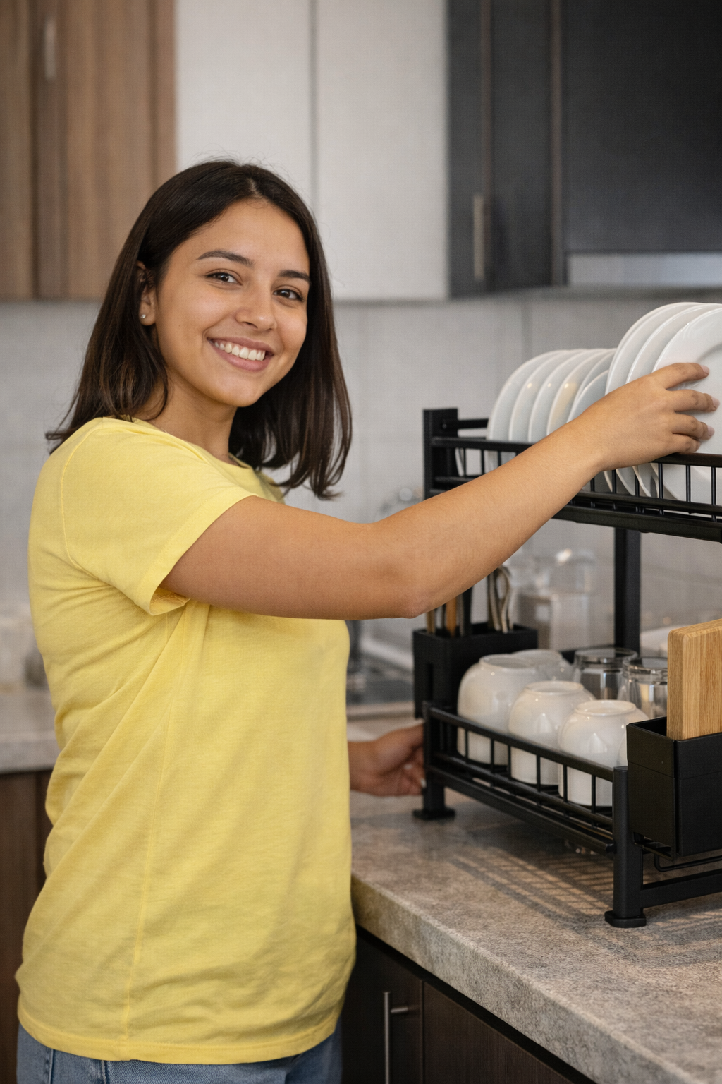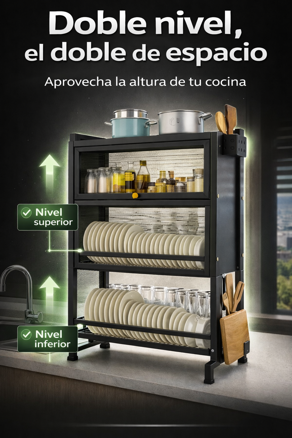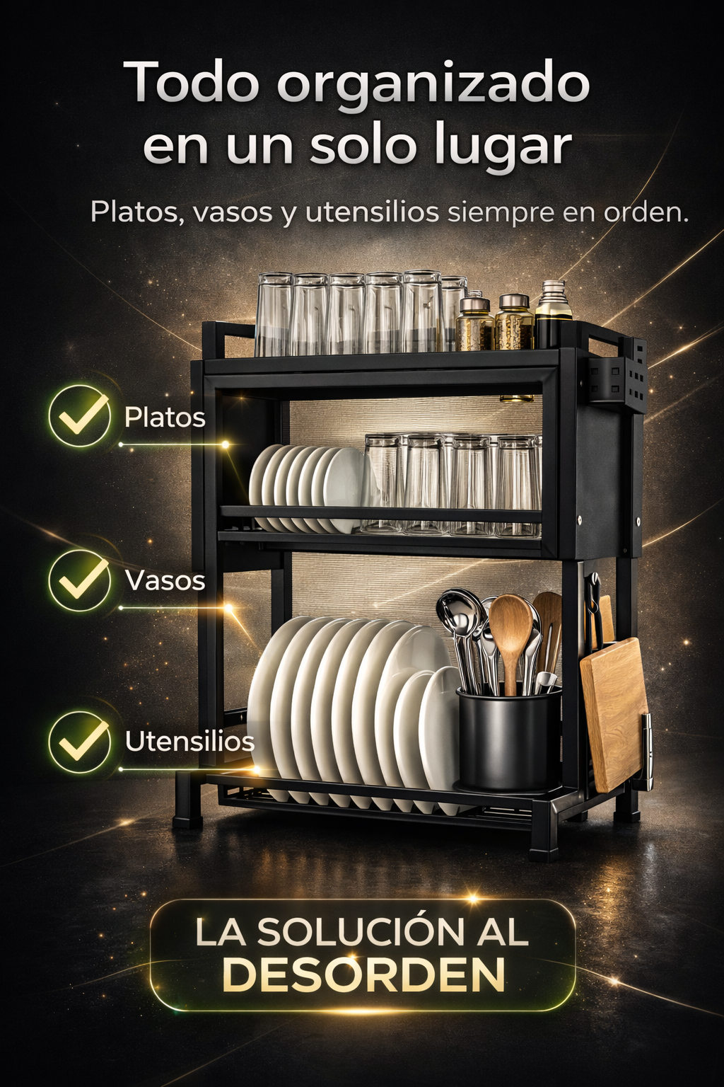 Permite organizar platos, vasos y utensilios en distintos niveles sin amontonarlos.