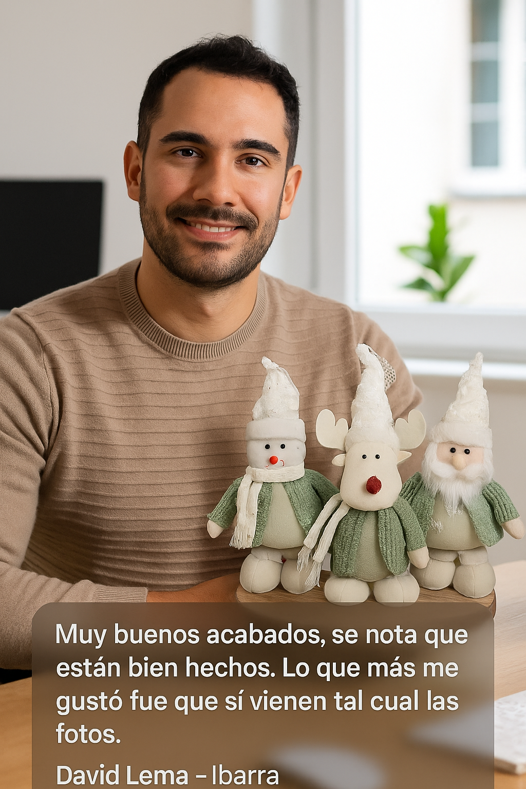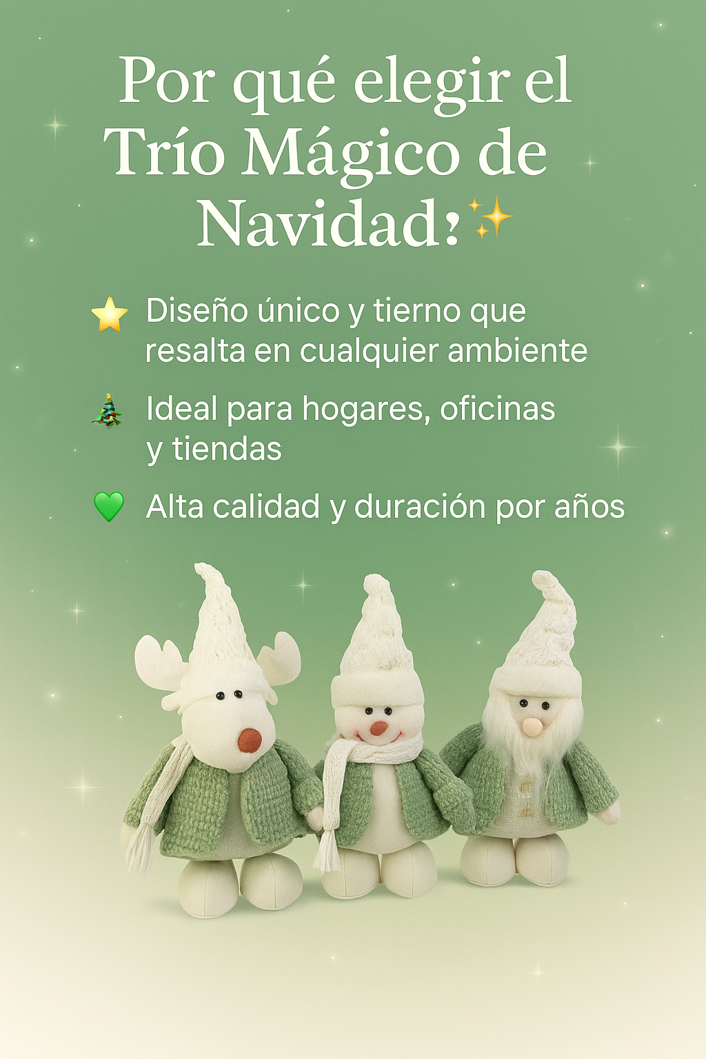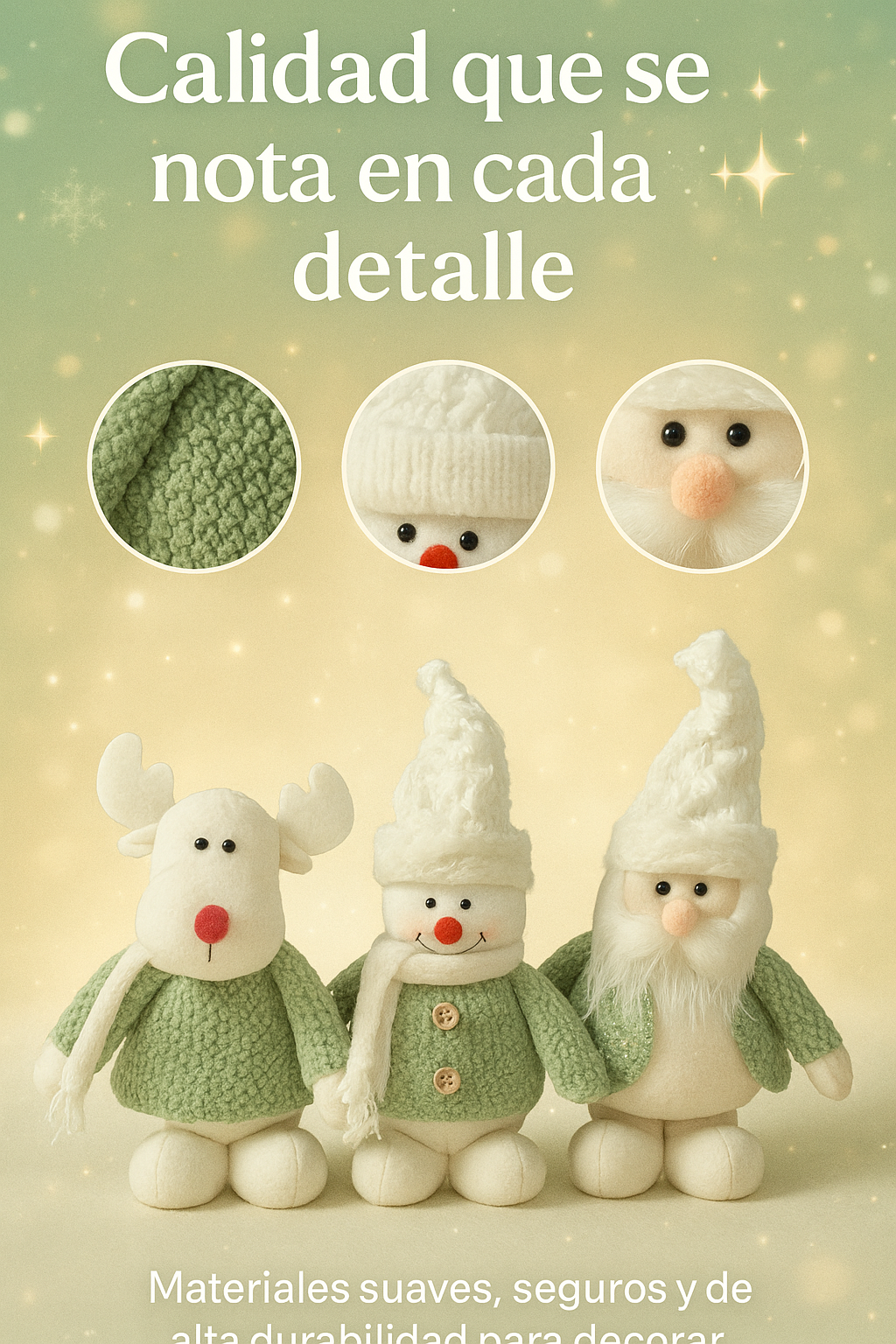 Los colores, detalles y tamaño del Trío Navideño lo hacen ideal para fotos con niños, mascotas o junto al árbol. Su estética armoniza con las tendencias visuales más usadas en redes sociales.