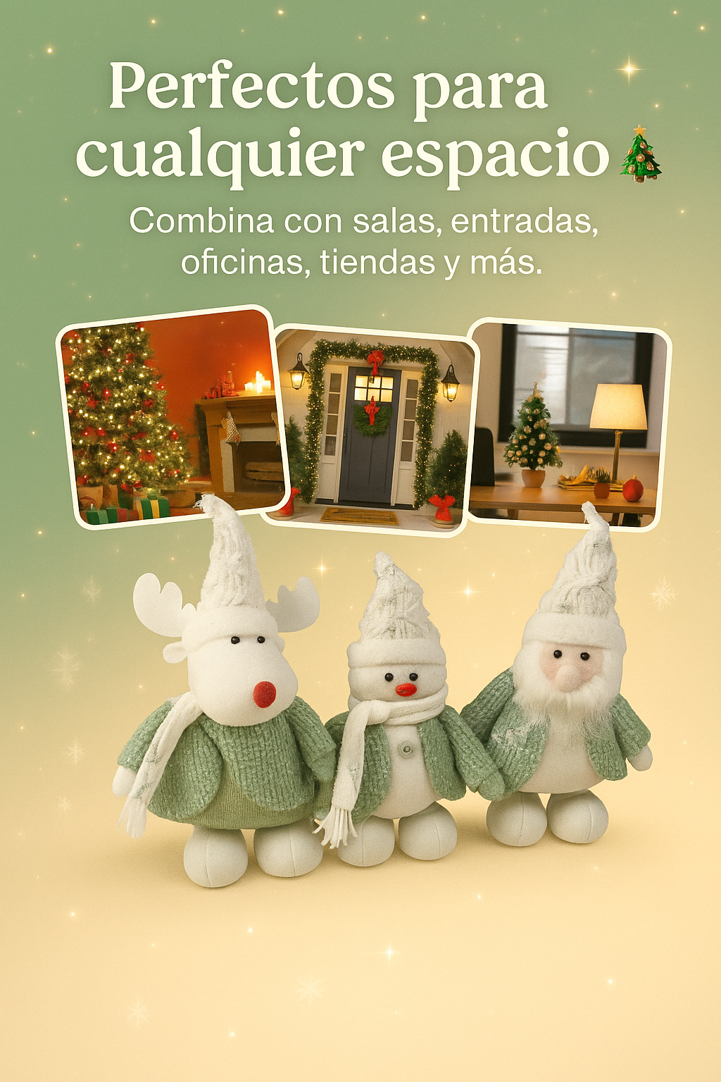 El Trío Navideño Deluxe funciona como un set decorativo listo para transformar cualquier espacio en un ambiente navideño cálido y mágico. Su diseño con detalles finos, colores modernos y base estable permite colocarlos sobre repisas, mesas, muebles, entradas o junto al árbol para crear un punto visual encantador.